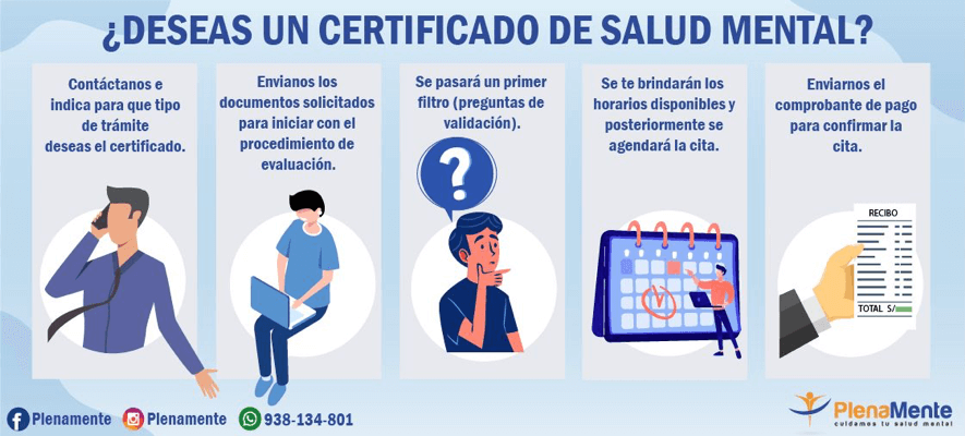 En PlenaMente realizamos certificado de salud mental, válidos para trámites notariales, académicos y/o administrativos, los mismos que son realizados por un médico psiquiatra. En este documento se certifica el estado de salud mental actual que presenta el usuario.